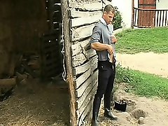 In the barn, a muscled city guy has a farm boy fucking his hungry butt
